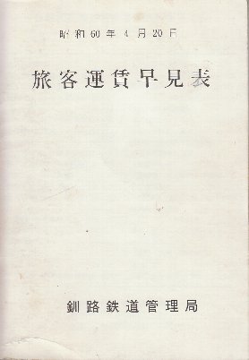 釧路鉄道管理局 旅客運賃早見表 昭和60年版