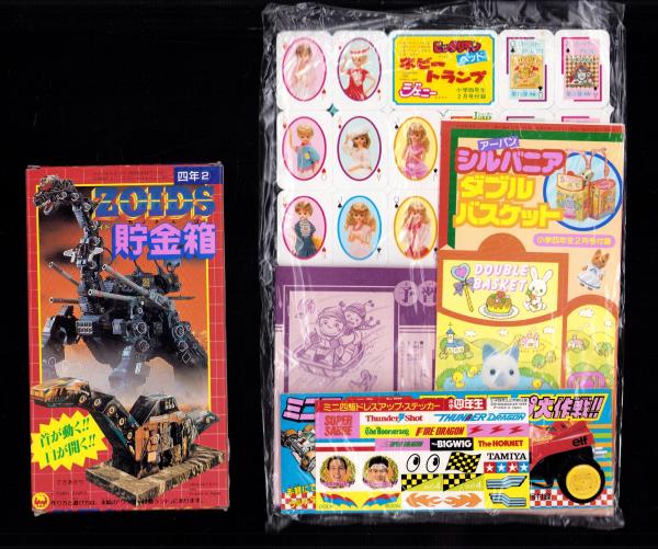 (付録)ゾイド貯金箱/ビックリマン・ジェニー・ホビートランプ/コミック版ミニ四トップのスピード・アップ大作戦ほか 6点一括 -小学四年生平成1年2月号付録-