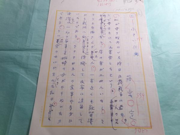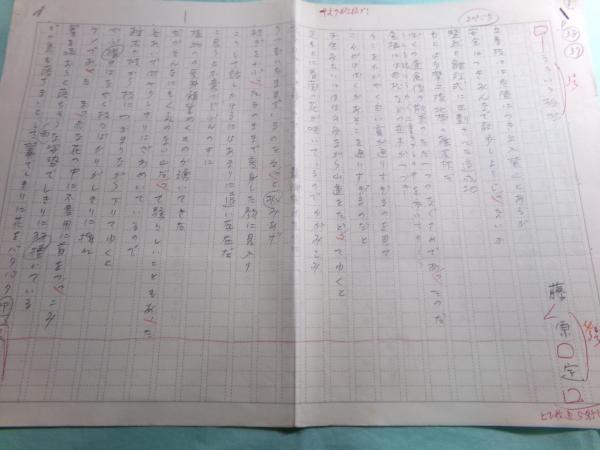 後藤一夫(本名=一雄)1912- 浜松師範学校出身教師で、浜松市役所教育課勤務(後に市内の小学校長を務める))の肉筆。ペン書き。400字詰原稿用紙。2枚。