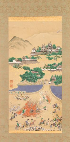 城下で行われる馬術による火渡りの行事もしくは神事を、市民が見物している図。「杉谷」「行宗之印」印。
