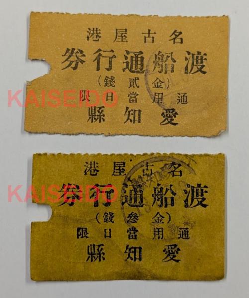 名古屋港の港新橋ができる以前の 渡し船の券と思われます。 1枚はスタンプを拡大すると 「11.6.21」で11年6月21日と思われ 金弐銭です。 もう1枚はスタンプを拡大すると 「13.8.29」で13年8月29日と思われ 金参銭です。 11年と13年の年号が 明治だとすると まだ熱田港時代で名古屋港呼びが不自然。 昭和だとすると 昭和7年にすでに港新橋が完成しており いわゆる名古屋港の渡船は 無くなっていたと思われる。 以上から大正11年と13年と思われます。 当方推測のためご自身でご判断願います。 二枚とも上下辺はミシン目で切られた跡と 入鋏有り。 ※状態C(経年傷み・ヤケ・シミ・汚れ。 折れ、シワ、フチ少破れ有り。)