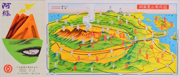 阿蘇登山案内図 雲仙・天草から外輪山~カルデラの中まで 産交バスと鉄道 裏面:阿蘇御案内、おてもやん、五木の子守唄、阿蘇の恋唄
