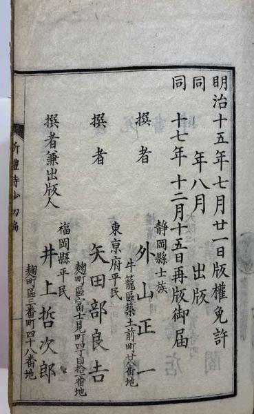 • 解説 再版 外山正一・矢田部良吉・井上哲次郎全選 和綴 (イタミ・奥付消跡有) 帙付(爪無)