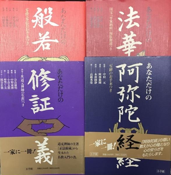 カバー(少ヤケ、スレ)。小口少ヤケ ----- あなただけの般若心経 中村元 監修 ; 阿部慈園, 高橋秀榮 ほか著 あなただけの法華経 中村元 監修 ; 阿部慈園 著 ; 梶谷亮治 図版解説 ; 高橋秀榮 書 あなただけの阿弥陀経 中村元 監修 ; 阿部慈園, 本部圓静, 高橋秀榮 著 あなただけの修証義 奈良康明 監修 ; 中野東禅 ほか著