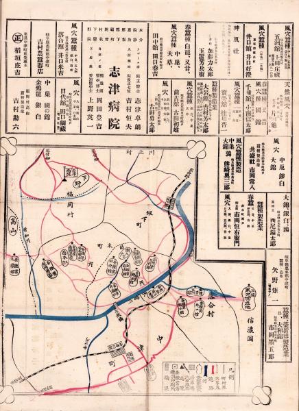 *52×38cm、〈中津川駅付近に東栄座劇場の記載あり〉〈裏面・中央線発車時間表、名古屋駅発車時間表、中津川駅ヨリ各地ヘ人力車賃金表〉