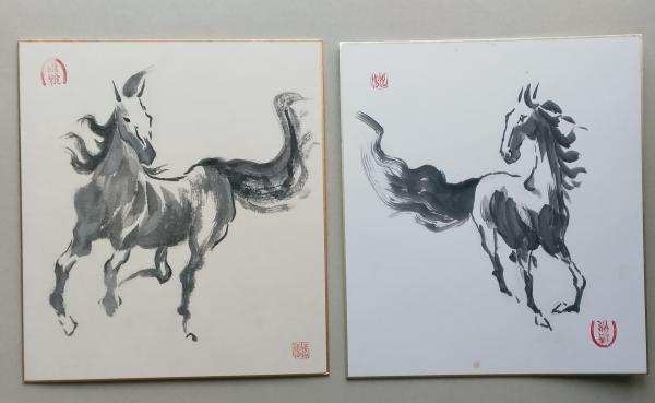 馬絵の色紙 2枚 千葉清悦 画 落款入り =「嘶き(いななき)」「幾山河 あゝ騎兵第四十七聠隊」「刑事の横耳」著者の色紙です=