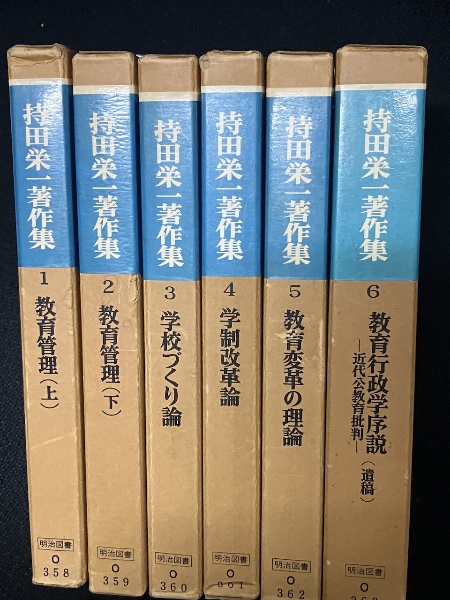 1巻・2巻・3巻に赤線引書込み、鉛筆書込みあり。函(ヤケ茶変色、カドスレ、ローマ字記名)。小口ヤケ。 ---- 1. 教育管理〈上〉 2. 教育管理〈下〉 3. 学校づくり論 4. 学制改革論 5. 教育変革の理論 6. 教育行政学序説(遺稿) ― 近代公教育批判 ―