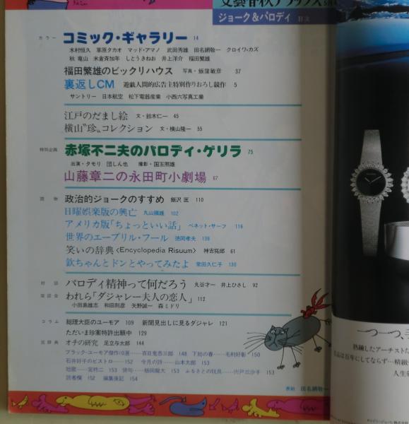 ”赤塚不二夫のパロディ・ゲリラ”出演=タモリ・団しん也、”横山隆一珍コレクション”、”対談 パロディ精神って何だろう”丸谷才一・井上ひさし、”江戸のだまし絵”。その他。