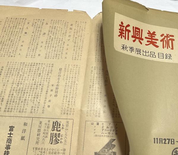 1枚を4つ折りしてB5サイズに 縁等切れ、破損多し 銀座三越での開催 寄文:茨木杉風、小林巣居人、鬼原巣俊、田中案山子、岡田魚降森、横田仙草、保尊良朔、児玉三鈴、岩崎巴人等 記載はないが、昭和26年に東京美術館で開催された公募再興第一回展の同年の秋季展の目録と思われる