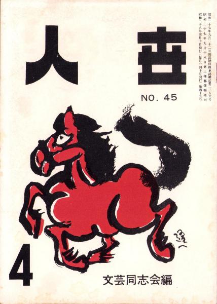 三角寛責任編集、〈三角寛「幽鬼(2)」9頁〉〈徳川夢聲「羅府日記」5頁〉〈山田善二郎「私は見ていた -鹿地事件の真相を訴える-」14頁〉〈間借生活者のための住み良い室の設計 -家の設計と室の設備- 4頁〉、井伏鱒二、北里俊夫、紺野靖彦、鳥飼参吉、山田善二郎、立花良夫、菊畑晴見、清川栄 、文藝同志会人世社 、昭和29年 、1冊