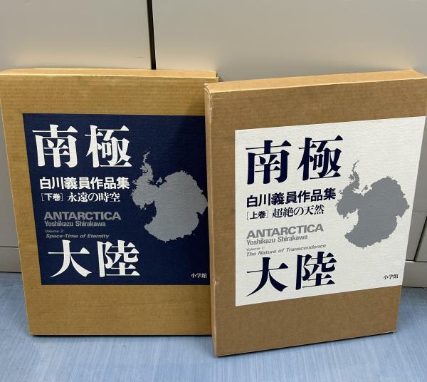 白川義員写真集 二重箱 本体状態並 初版 各巻171頁 上巻 氷雪茫々(南極半島)、氷上可憐(皇帝ペンギン)、氷峰屹立(エルワース山群) 下巻 大陸鳥瞰(南極大陸一周)、氷雪脊稜(南極横断山脈)、極光夢幻(太陽・月・オーロラ) 1冊箱サイズ31x43,5cm 総定価78.000円 ISBN:4-09-699105-8/4-09-699106-6