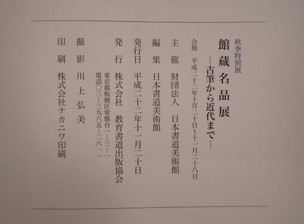 説明:「館蔵名品展 : 古筆から近代まで : 秋季特別展」は、日本書道美術館が編纂し、教育書道出版協会から2010年11月に刊行された書籍です。本書は古筆から近代にわたる書道作品の名品を集めた秋季特別展の内容を紹介しており、展覧会の雰囲気を伝えながら、作品の持つ歴史的価値や美術的特徴について触れていると考えられます。書道や日本の伝統文化に関心がある方にとって、資料的な価値が感じられる一冊です。