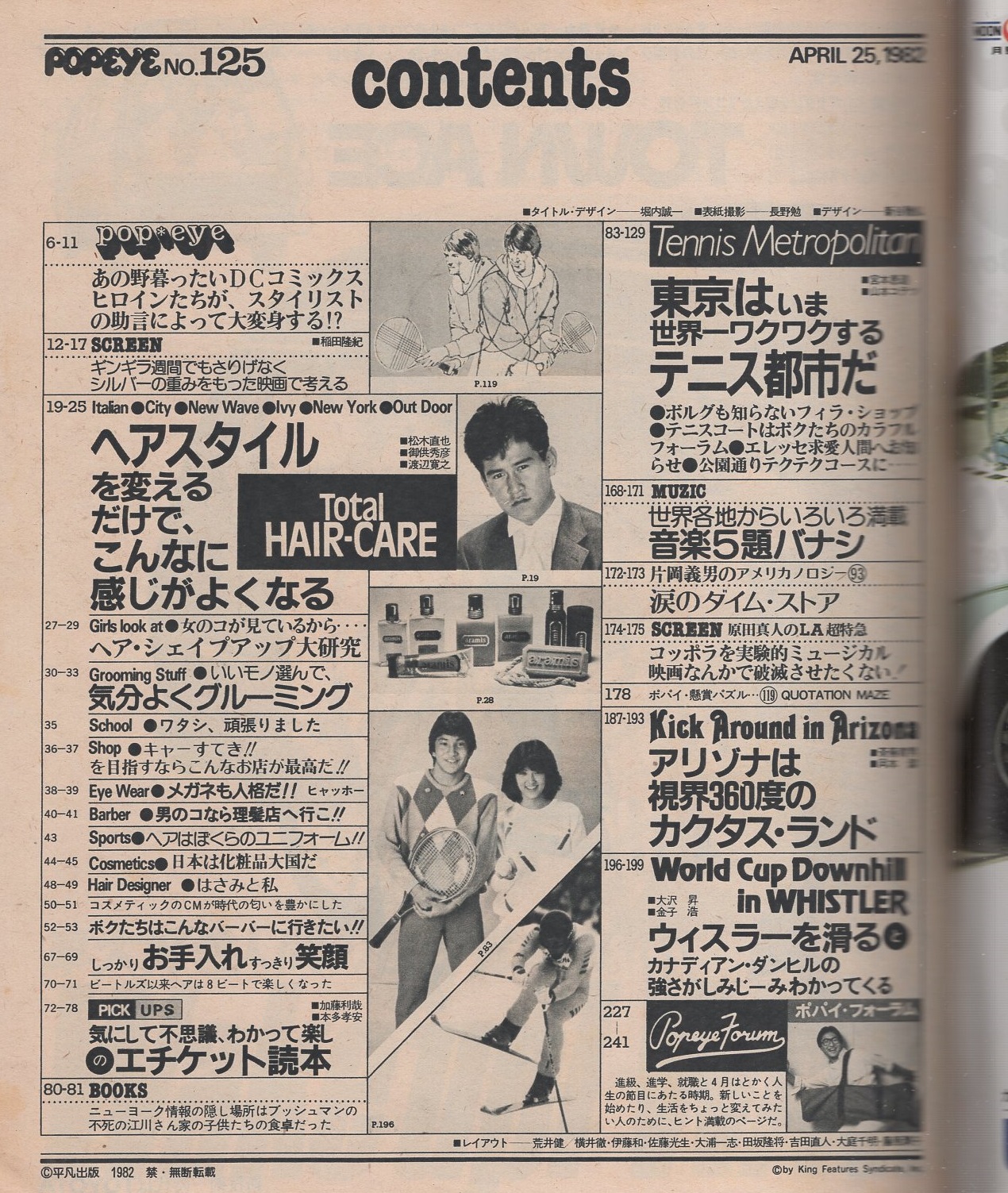 • 著者 〈ヘアスタイルを変えるだけでこんなに感じがよくなる 37頁〉〈気にして不思議、わかって楽しのエチケット読本 7頁〉〈東京はいま、世界一ワクワクするテニス都市だ 32頁〉〈片岡義男のアメリカノロジー 2頁〉〈原田真人のLA超特急 2頁〉〈アリゾナは視界360度のカクタス・ランド 7頁〉
