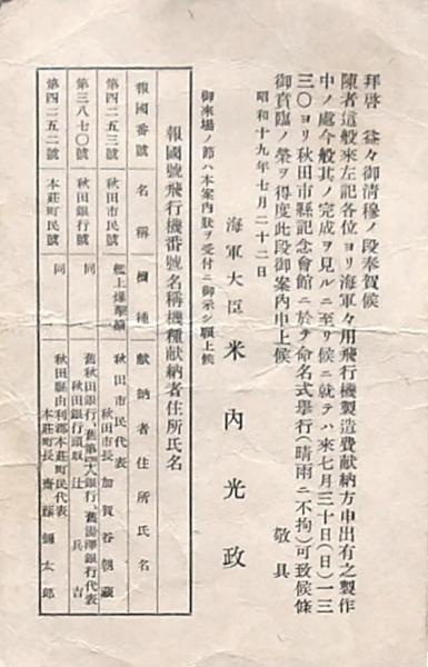 • 解説 海軍々用飛行機製造費献納方申出有之製作中の処、その完成を見るに至り命名式挙行の案内状
