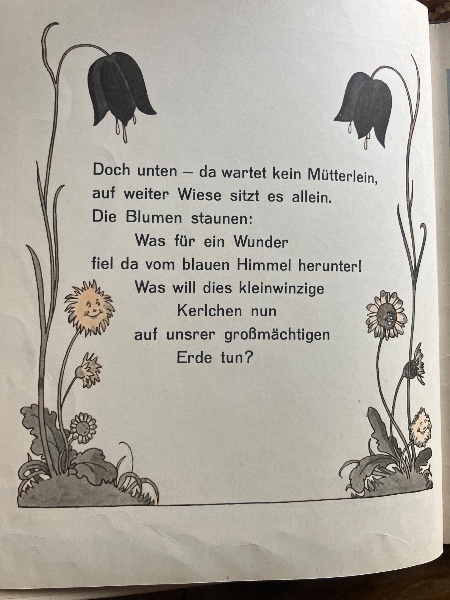 地上に落ちてしまった天使の子供が、様々な自然界の動物たちと出会いながら、最後に人間の母親を見つける話。ドイツ語。貴重な初版です。