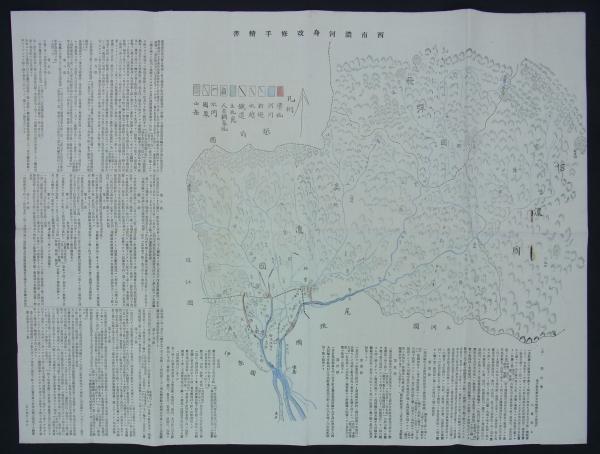 川路利恭岐阜県知事に提出された西南濃河川改修に関する嘆願書とその理由書。活字三段組で両面に亘る長大なもの。表面三分ノ二程は三色刷の当該計画図。