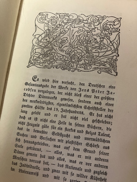 日本でも戦前から愛されてきたハインリヒ・フォーゲラーによる装釘です。フォーゲラーは、ヴォルプスヴェーデ芸術村で活躍しましたが、同じくヴォルプスヴェーデに滞在した詩人ライナー・マリーア・リルケがヤコブセンを愛したことも知られています。OLn, etw. ber. u. fleckig, sonst sehr gut.