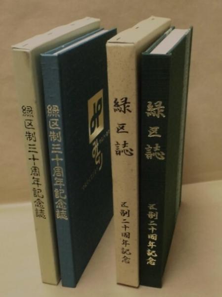 緑区誌 区制二十周年記念、緑区制三十周年記念誌、の2点一括です。 各、歳月を経過したものですので、外箱には軽い日焼けやスレなどの劣化があります。『緑区誌 区制二十周年記念』の外箱には小さな点シミが出ています。本体のコンディションはおおむね良好です。