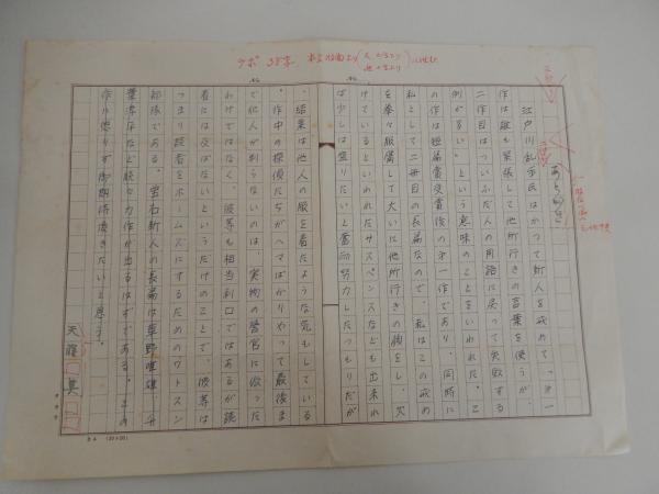 天藤真 直筆原稿 400字詰原稿用紙1枚江戸川乱歩史はかつて新人を戒めて・・・岩谷書店編集者旧蔵1962年、旧『宝石』に投稿した『親友記』が宝石賞に佳作入選して、作家活動を開始。また同年『陽気な容疑者たち』が第八回江戸川乱歩賞の最終候補となり、大下宇陀児らの推薦を得て翌年刊行に至る。1963年、『鷹と鳶』で第二回宝石賞を受賞。1979年、『大誘拐』で第三十二回日本推理作家協会賞を受賞。