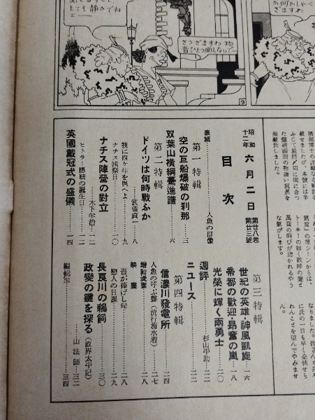 • 解説 表紙:人魚の群像/特輯:ナチスドイツの実現/ヒンデンブルグ号の惨事/双葉山横綱/世紀の「神風」凱旋/信濃川発電所