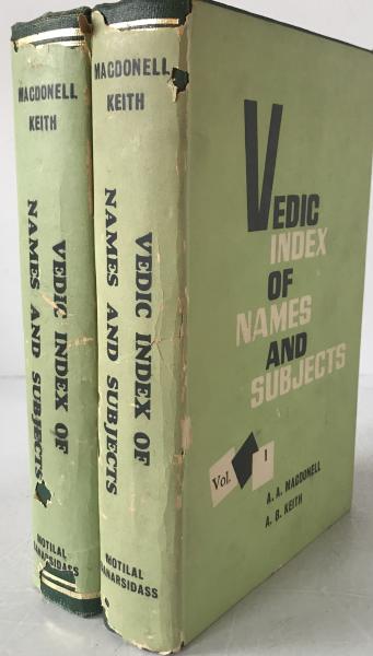 This is the complete two-volume set of the Vedic Index of Names and Subjects, a very important reference book for studying ancient Indian history and Vedic texts. It was written by Arthur Anthony Macdonell and Arthur Berriedale Keith. Think of it as an encyclopedia for the Vedic period. It explains all the names of people, places, and tribes, as well as subjects like daily life, laws, and religion, using examples from the original texts. This is the 1958 reprint from Motilal Banarsidass (MLBD), a well-known Indian publisher. Volume I includes the original fold-out map of VEDIC INDIA. The books themselves are in good shape. The dark green hardcovers are strong, and the bindings are secure. The pages inside are clean with no writing, though they have yellowed with age. The removable paper covers dust jackets are in poor condition. They have large tears, chips, and missing pieces, especially at the spine. They are also scuffed and stained.This is a working copy for a student or researcher