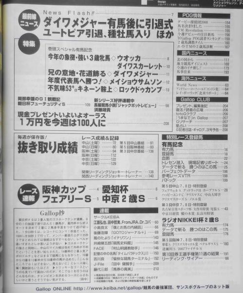 最前線ニュース/ダイワメジャー有馬後に引退式/ユートピア引退、種牡馬入り 他 特集/巻頭スペシャル有馬記念 ウオッカ/ダイワスカーレット/ダイワメジャー/メイショウサムソン/ロックドゥカンブ 岡部幸雄のGⅠ観戦記/朝日杯フューチュリティS 長編競馬小説「ジャックポットレビュー」須藤靖貴 レース速報/阪神カップ・愛知杯・フェアリーS・中京2歳S 他