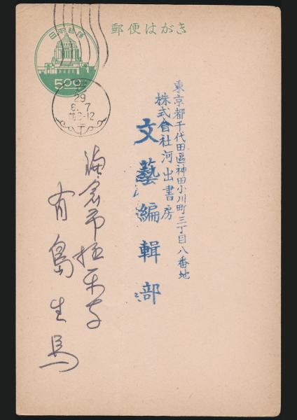 青山光二葉書 中央公論社・岩渕鉄太郎宛