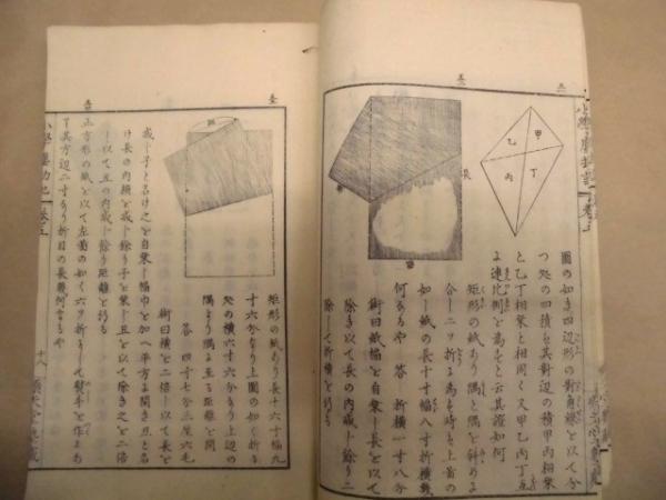 • 解説 (明治期小学校の算数和算教科書)全3冊の内の三1点です。五之巻と六之巻の部分が収録されています。和装、約23×16cm、49+48丁 表紙に図書ラベル、表紙と巻頭に「愛知県渥美郡五番小斈三吉野学校印」、地の部分には表題の記入があります。半世紀以上の歳月を経過したものですので、日焼けやスレ、小さな経年シミ、紙面の角に小さな折れ跡、一部綴じ糸の切れ、小さな虫喰い穴などの劣化があります。通読に支障はありません。