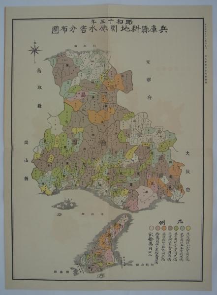 • 解説 昭和13年阪神大水災の兵庫県耕地被害地図。県内市町村を7段階の被害金額別に色刷図示したもの。/折畳保存。経年薄ヤケ有り。
