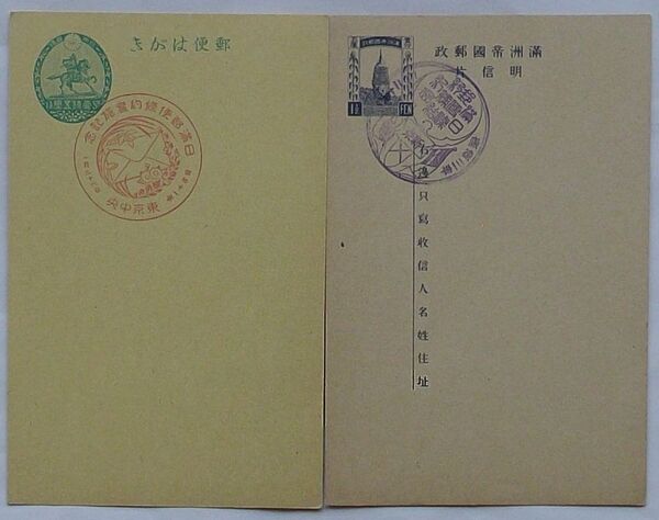 日本郵便はがきに「日満郵便条約実施記念」 ・満洲帝国郵政明信片に「満日郵便条約締結紀念」スタンプ付