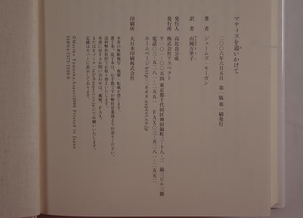 説明:ジェームズ・モーガン著、山岡万里子訳の『マティスを追いかけて』は、2006年にアスペクトから刊行された作品です。本書は、画家マティスに関する内容を扱っていると考えられ、作者の視点からその魅力や影響を追究している可能性があります。美術や芸術に興味のある読者に向けて書かれているかもしれず、著者の筆致や訳者の工夫によってマティスの世界を伝えようとしている一冊と言えそうです。