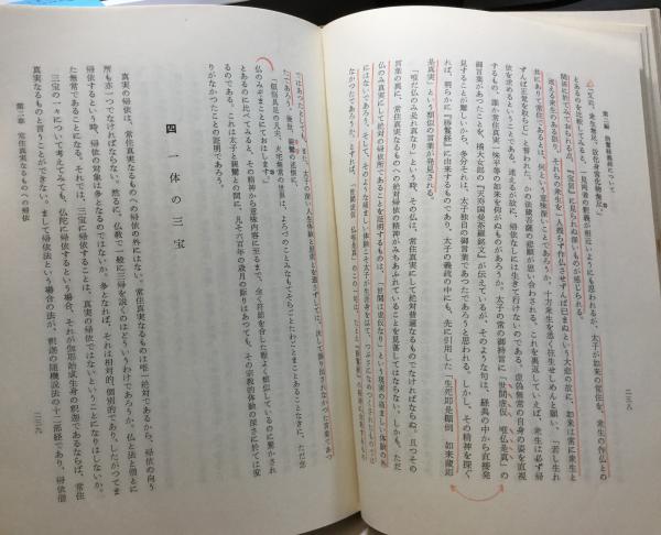 • 解説 初版 三経義疏について 函ヤケ  朱線引き、薄い鉛筆での書込み1/3以下のページにあり 三方ヤケシミ