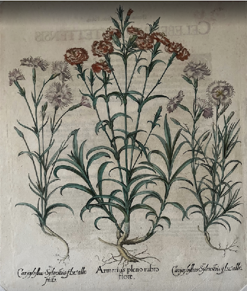 バシリウス・ベスラー『アイヒシュテット庭園植物誌 Hortus Eystettensis』よりカーネーション(撫子)の図譜 推定三版(1713年)銅版手彩色