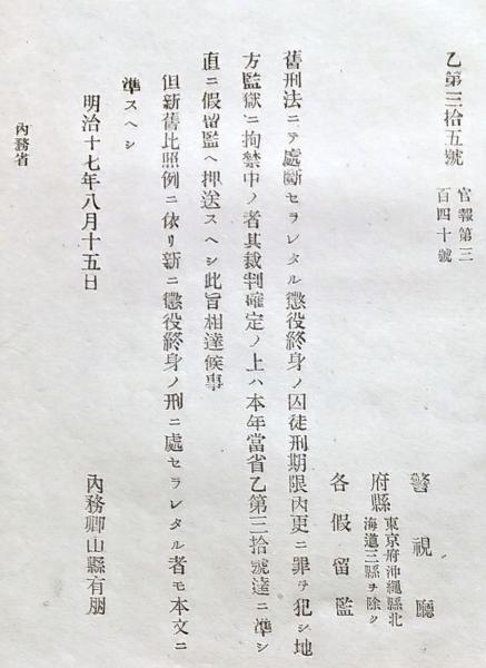 明治政府布告 旧刑法にて処断せられたる懲役終身の因徒 明治17年〇和本 古書 古文書