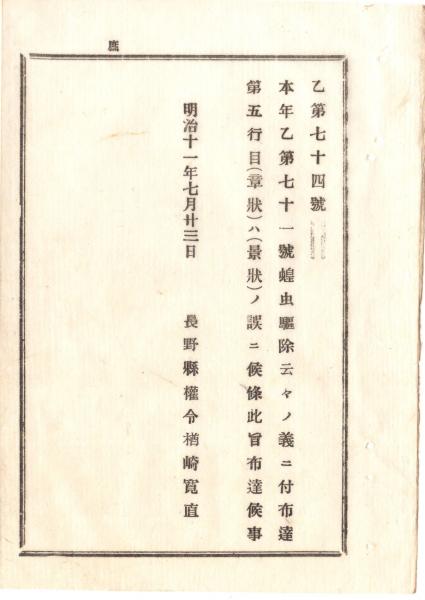 明治布告布達 明治11年○ 東京府神奈川県内で蝗(イナゴ)虫発生 稲苗に被害 発生あらば速やかに駆除 駆除方法等警告 長野県権令楢崎寛直 長野県○和本古書古文書
