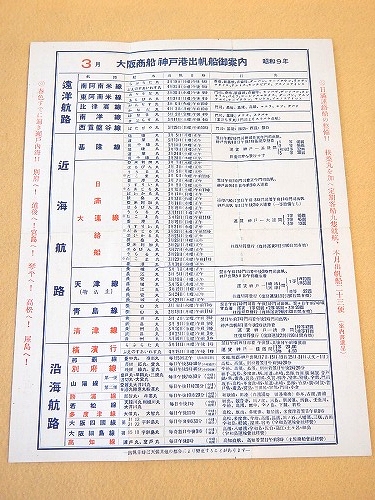 • 解説 大阪商船 神戸港出帆船御案内(日満連絡船など)、神戸-門司間直行船。出帆時刻表。戦前。約29×22センチ。一枚もの。