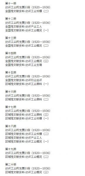 清末から民国時期(1900-1949年)に出版された紡績工業調査報告及び関連統計報告1000余種(篇)を収録。内容は紡績原料の需給、紡績工業の生産、紡績工業の配置、紡績産業の工人などに及ぶ。中国近代民族紡績工業発展史の全面的な記録であり、中国近代紡績工業発展史の研究と近代紡績史料出版の整理研究の空白を埋め合わせる作品である。