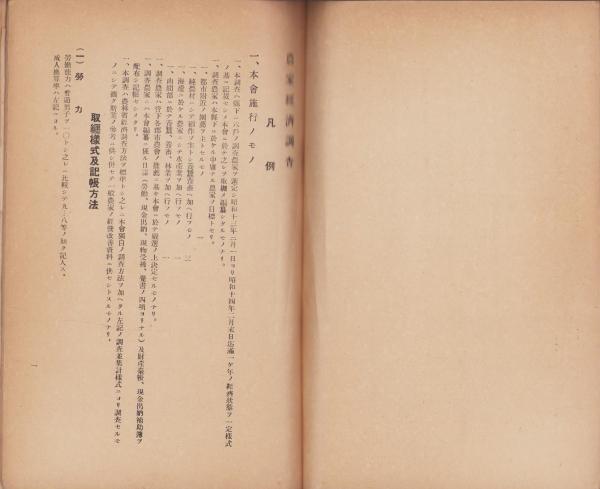 • 解説 *A5判、合計30頁、折込表6枚(農家経済調査一覧表、家計費ノ比較、家族労働日数表、各農家平均一覧表、農林省委嘱経済調査各農家別一覧表、家族一覧調査表)
