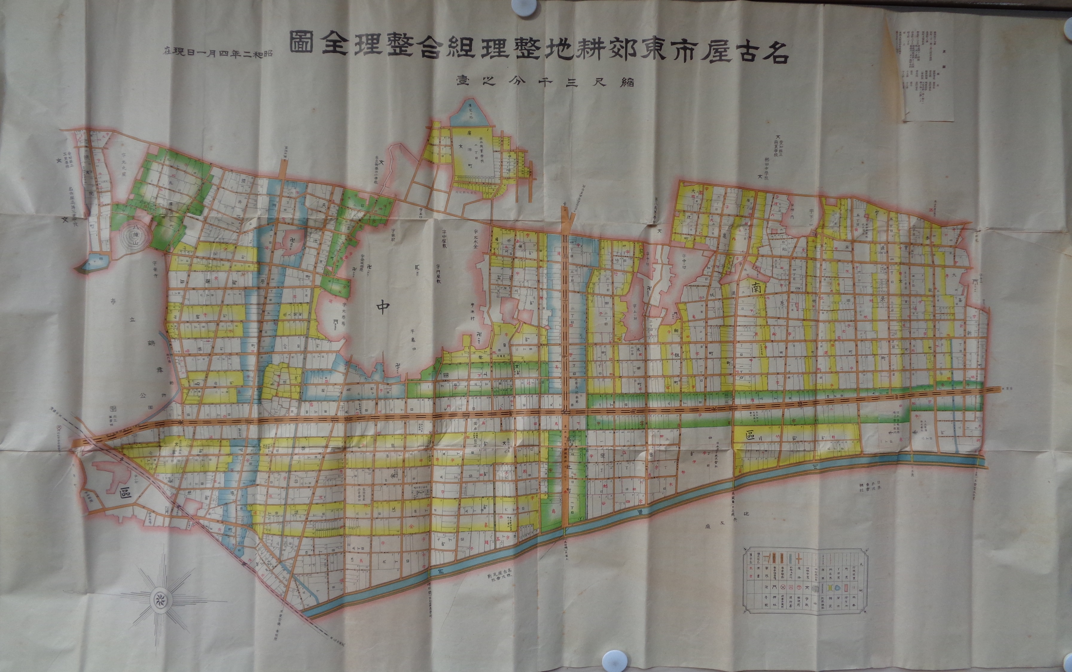 • 解説 **〈名古屋市東郊耕地整理組合整理全図 78×132cm、3千分1、片面刷〉〈名古屋市東郊耕地整理組合競売地案内図 青焼、52×78cm〉〈申込書 B5判、孔版、2丁、片面刷〉〈酒・折詰引換券 8×10cm、片面刷〉〈封筒2枚〉