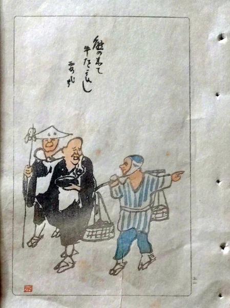 D26021501〇中村不折俳画 彩色木版画 托鉢僧 熊の来て牛闘ひし霞哉 明治43年〇和本古書古文書