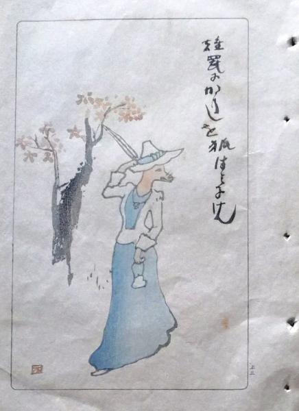 D26021503〇中村不折俳画 彩色木版画 狐 雉罠にかかりしを狐食みにけん 明治43年〇和本古書古文書