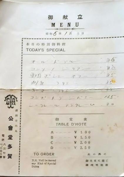 D26012805〇一枚刷り 料理献立 盛岡市 公会堂多賀 昭和年代〇和本古書古文書