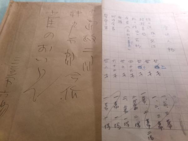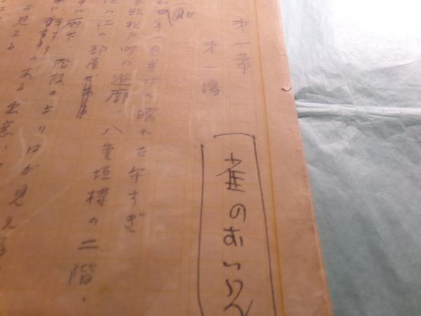 小島政二郎の肉筆は、青字の登場人物訂正部分(青字)、3幕の加筆訂正部分、付属する封筒の表書「小島政二郎 神戸太郎合作 雀のおいらん 三幕六場」と、封筒裏書の「昭和三十年二月八日作」のみと推察される。ほとんどが神戸太郎という人の筆になるものか??