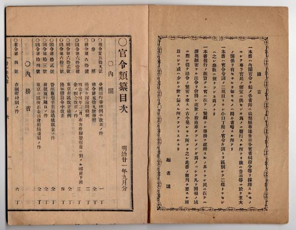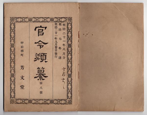 官令類纂 内閣令・貸座敷引手茶屋娼妓賦金地方税に編入○山梨県令・韮崎察署所属小渕沢交番所ほか廃止○明治7年太政官布告 米麦輸出禁止○甲府柳町 芳文堂 山梨県 明治21年8月分〇和本古書古文書