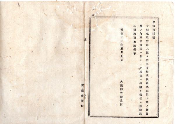 • 解説 N25080122〇明治布告布達 明治11年○株式取引所は東京大坂に於て一カ所宛に限る 大蔵卿大隈重信○大蔵省布達 栃木県○和本古書古文書
