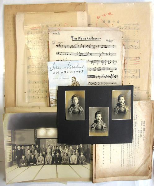 ●手写楽譜 モーツァルト他約20枚 ●楽譜版下・ゲラ約63枚 ●東京音楽学校亥萩会関係資料及集合写真 ●田中正平案「狭幅ピアノ鍵盤」に就て楽器改良研究会 ●1930年前後独逸音楽書カタログ21部 ●小学校の唱歌教材に関する法規に就て 昭和11年 ●文部省在外研究員表 昭和7年 ●昭和11年福島県師範学校一覧(大イタミ) ●楽譜出版ニ関スル規定 昭和13年 ●南葵音楽事業部摘要第一 昭和3年 ●改正青年学校教練科教授及訓練科目要旨並ニ要目 昭和16年 ●柴舟会事業報告書 昭和6年 ●伽陀音楽論 昭和9年 ●嘉納先生教育功労記念会誌 昭和12年 ●福島県大観 昭和11年 ●福島同窓会報 昭和12年 ●教科用図書活字組方見本 昭和14年 ●標準漢字表 昭和17年 ●ことばのしるべ他戦後当用漢字関係7点