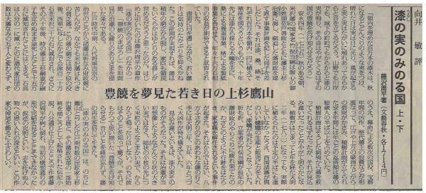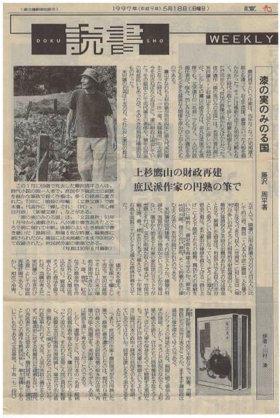 • 解説 単行本・初版・上下巻揃。藤沢周平の絶筆となった最後の長編小説。貧窮にあえぐ米沢藩の藩政再建に無私の心で挑んだ上杉鷹山(治憲)と執政たちの苦闘を描く、著者畢生の歴史長編。『文藝春秋』1994年1月号より連載、病に倒れて中断、病床で書いた原稿用紙6枚の結末部が著者逝去後に発表されたことで知られる。函・帯付き、初版。発刊直後(1997年5月18日付)の新聞書評切抜2点を同封——読書WEEKLY(評者・山村湊、見出し「上杉鷹山の財政再建 庶民派作家の円熟の筆で」)および向井敏による書評(見出し「豊饒を夢見た若き日の上杉鷹山」)。著者逝去直後に刊行された絶筆作品への同時代の評価を伝える一次資料として希少。