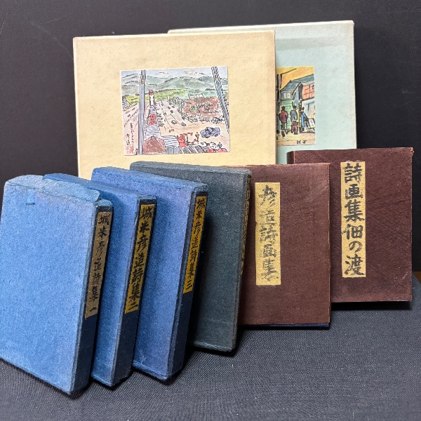 • 解説 「彦造詩画集/詩画集佃の渡」は全て肉筆詩及び水彩画、「望郷(特装版)/遍歴(特装版)」は肉筆水彩口絵一葉入り 帯