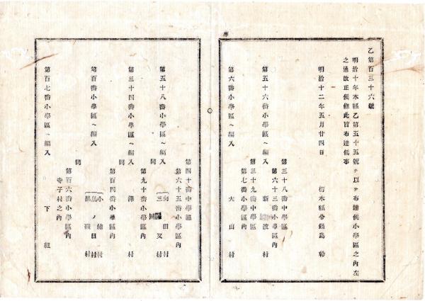 明治布告布達 ○小学区の内 6件の改正(小学区編入) 新波村を第56番小学区へ編入 大山村を第6番小学区ほか 栃木県令鍋島幹○明治12年 栃木県布達○和本古書古文書