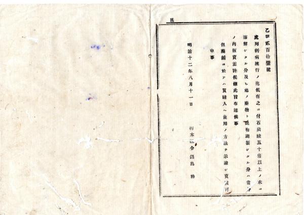 明治布告布達 ○虎列刺(コレラ)病流行の兆候に付 石炭酸五十倍以上の水溶液及他薬物と混和調製したる分 販売を許す 栃木県令鍋島幹○明治12年 栃木県布達○和本古書古文書